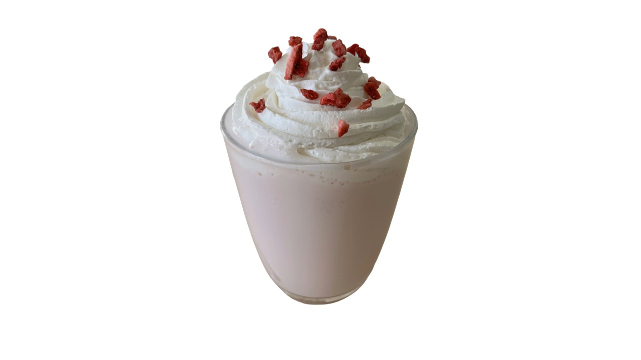 - いちご風味のクリームと牛乳をミキサーし、ホイップとドライイチゴをトッピングした優しい甘さのイチゴミルク味のドリンクです。