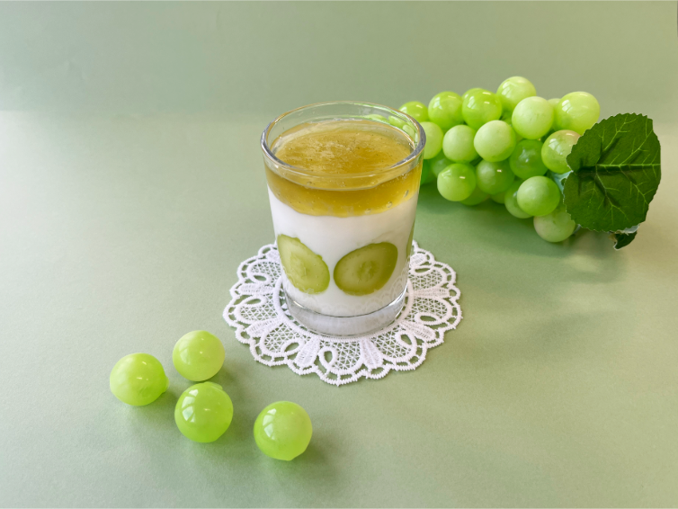 - 杏仁豆腐にシャインマスカットのゼリーをトッピングしました。杏仁豆腐の風味とシャインマスカットの爽やかな味わいが美味しいカップデザートです。
