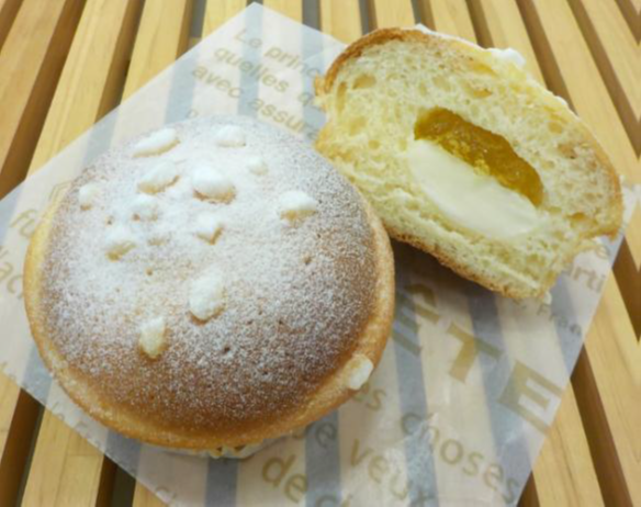 - 口どけの良い生地にクリームチーズ風味のクリームとパイン風味のゼリーを合わせました。パインの酸味とクリームチーズのコクのバランスが美味しいパンです。