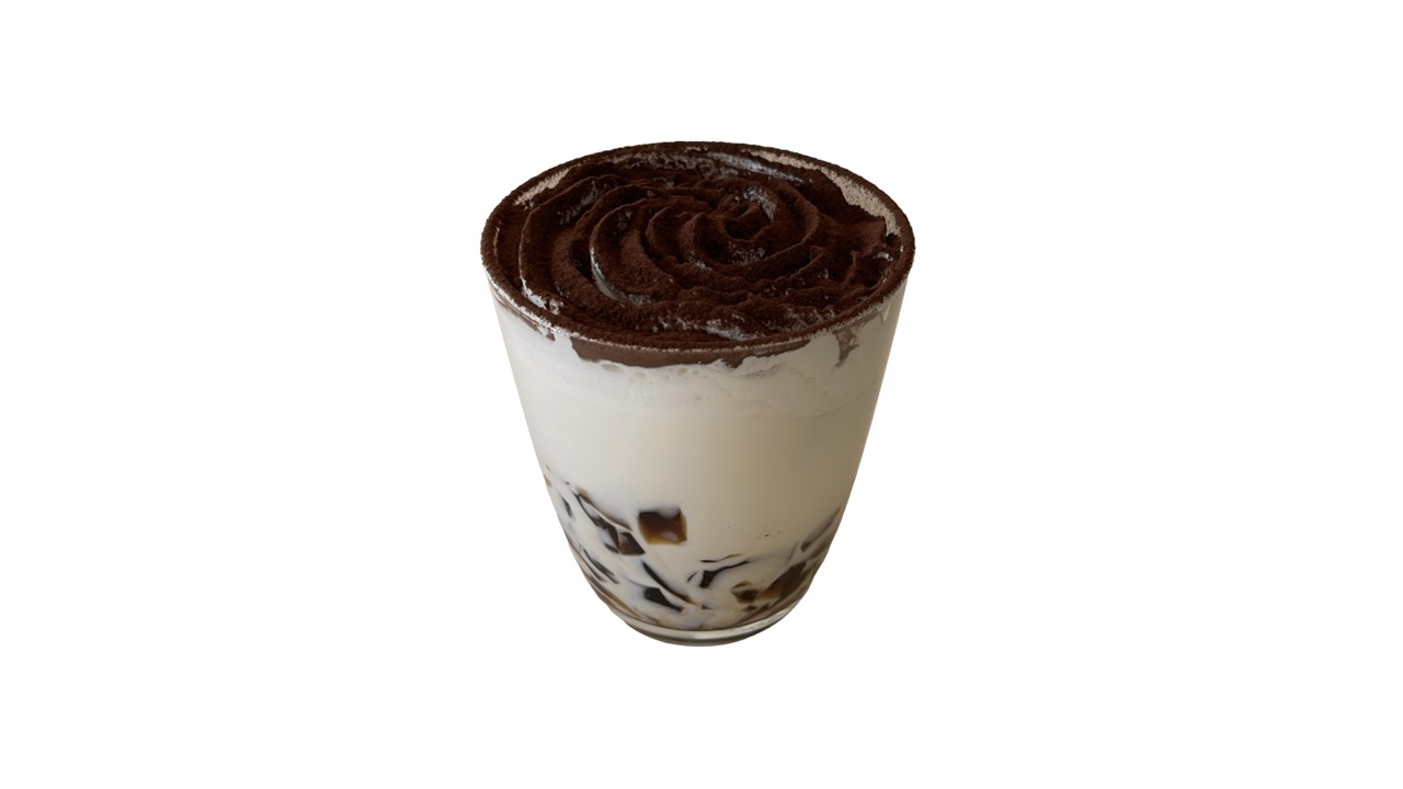 - チーズケーキ風味のクリーム、牛乳、コーヒーゼリーをミキサーにかけ、ホイップとココアパウダーをトッピングしたティラミス風のドリンクです。