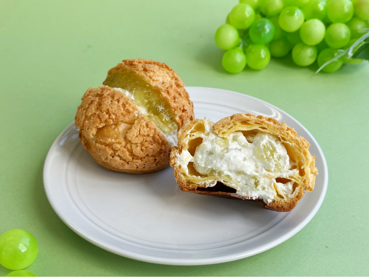 - ハードタイプのさっくりとしたシュー生地に、クッキー生地を被せて焼き上げ、マスカット風味のゼリーを軽く混ぜたホイップをサンドしました。