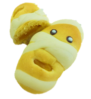 かぼちゃ入り菓子パンにかぼちゃ風味のクリームを合わせたハロウィン向けのパンです。白生地を巻きつけることでミイラに見立てました。