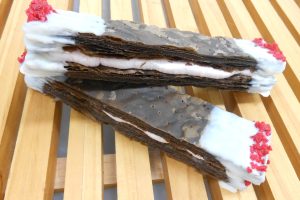 焼成後仕上げ | 140×30(㎜)にカットし、*じゃりっtoいちごをサンドします。両端にホワイトチョコを付け、ドライフランボワーズをトッピングします。 |
