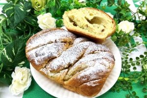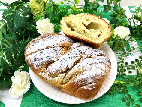 20cm×20cmに伸ばし、(※1)メロンクリーム フィリング115gを塗り、巻いたものを半分にカットし、2本編みにする。 |