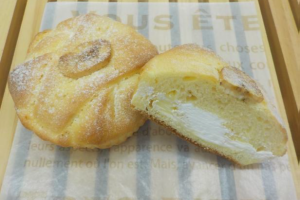 リッチな味わいのスイートロールに、バナナ風味のシートを折り込み、バナナ風味のクリームを包んで焼き上げ、仕上げにホイップクリームを注入しました。バナナの風味たっぷりのパンです。