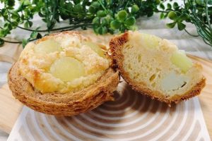 メロンの王様であるクラウンメロンの果肉をトッピングしたこと、パンを半球形にしたことで見た目に特徴を出し、歯切れの良い、ケーキのような食感のブリオッシュ生地とジューシーな果肉をFPクラウンメロンと合わせることで食べやすくしました。食感のアクセントにサクサクのデニッシュ生地を、味のアクセントにココナッツ生地を組み合わせ、見た目・食感・味に特徴を出すことで、クラウンメロンの魅力をより引き立たせた商品になっております。特徴ある仕立てにすることで、クラウンメロンとの新しい組み合わせを発見・提供できたらなと思い作りました。