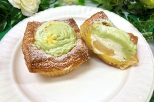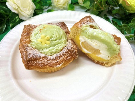 現在、栗以外にも芋、チョコレート、苺などのモンブランが多数出回る中、メロンのモンブランはまだあまり見たことがないと思い、この作品を作るに至りました。サクサクの生地に口いっぱいに広がるクラウンメロンの香り。生クリームの優しい甘さにジンジャーエールゼリーのぷるんとした食感。そして最後にほわカスターの卵の風味がほわっと口の中に残る一品です。仕上げをどうしようか迷って色々調べていたところ、クラウンメロンのお花が鮮やかな黄色でとても可愛らしいことを知り、パンにも咲かせることに決めました。
