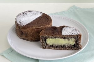 チョコロールインマーガリンを折り込んだデニッシュ生地をパルミエ状に焼き上げ、クラウンメロン風味のクリームを注入しました。チョコの甘みとクラウンメロンの爽やかな風味が美味しさのポイントです。