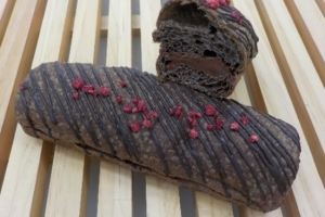 軽い食感のエクレア風デニッシュに濃厚なチョコ風味のクリームと木苺ジャムを混ぜ合わせた、ガナッシュ風のクリームをサンドしました。甘味と酸味のバランスが良いパンです。
