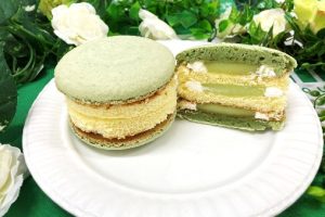 ③②のスポンジの上に、ホイップクリーム8g、FPクラウンメロン15gを絞り、マカロンを重ねる。 |