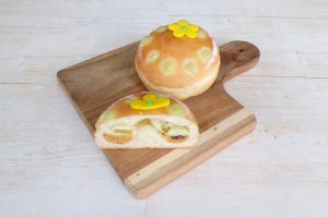 ①焼いたクレームダマンドにクラウンメロンDXを5g絞る。 ➁①にりんごコンポートを8g乗せクラウンメロンDXを10g絞る。 ➂食パン生地50gを丸く伸ばし②を包む。 ④シリコン型に入れる |