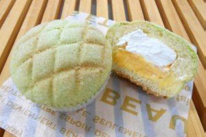 リッチな味わいの菓子パン生地に、緑色のメロン皮をかぶせ、北海道メロン風味のクリームとホイップクリームを合わせました。