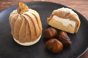 | 焼成後仕上げ | ホイップクリームを絞り、その周りに*CF和栗を飾り絞りします。粉糖をトッピングし、渋皮栗を飾ります。 |