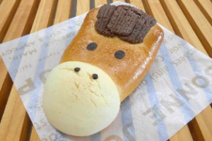 菓子パン生地に牛乳風味のクリームを細長く包み、馬の形に仕上げました。