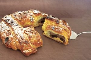 和栗風味のクリーム、スポンジケーキ、鹿の子豆、柚子ピールを包んだ、贅沢な味わいのパイです。サクサクのパイの食感で、