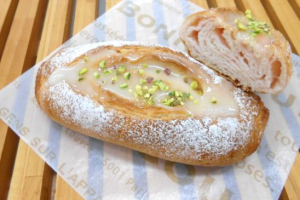 ソフトフランス生地に、ミルクの風味がほんのりとする桜花と桜葉入りの桜風味のシートを折り込み、クリームチーズ入りのフォンダンを合わせました。「和」の桜の風味と、「洋」のクリームチーズのコクが美味しいパンです。
