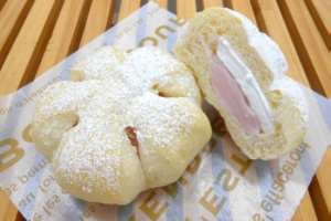 白焼きのソフトフランス生地に、桜風味のクリームとホイップクリームを合わせました。花形に焼き上げ、春の桜を感じさせるパンです。
