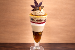 和栗をふんだんに使ったデザートパフェに、ほうじ茶ゼリーや赤スグリジャム等の栗との相性が良い素材を組み合わせました。