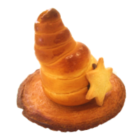 キャラメル味のハロウィン向けのキャラクターパンです。コロネを立てて焼成することで、魔女の帽子に仕上げました。
