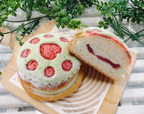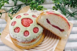 冷めたら半分にカットして、中にメロンクリーム60gとイチゴのジュレ20gを絞ってのせてはさむ。上に粉糖をふる。 |